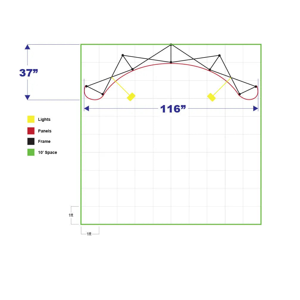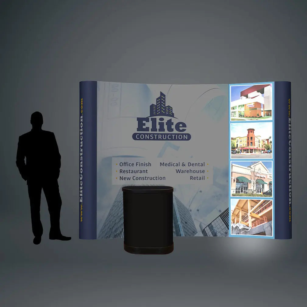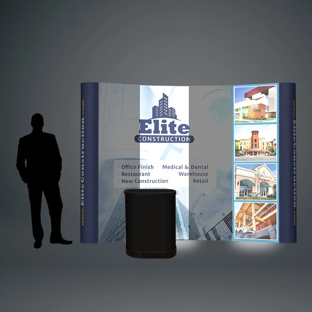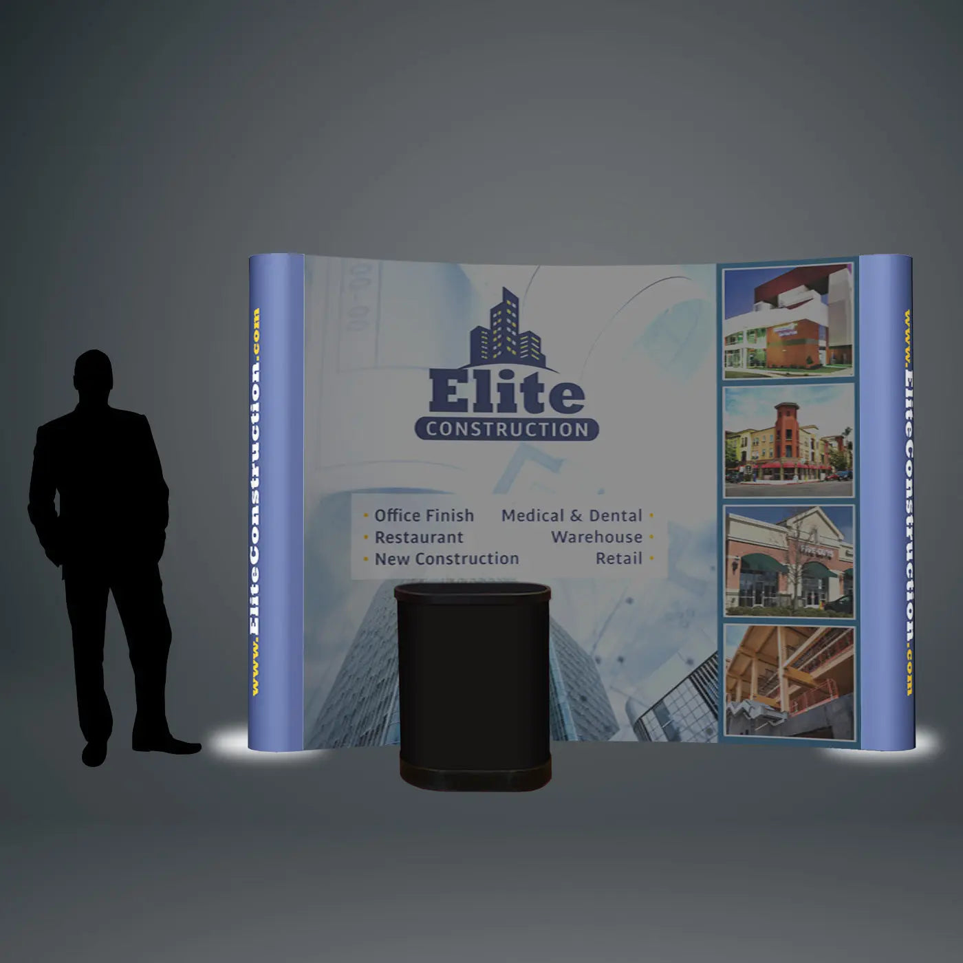 Our most popular size choice and “biggest bang for the buck” is the floor-standing 10’ pop-up display. It can be easily transported and set up by a single person in just minutes. This offering is perfect for the standard 10’x10’ display area and offers some of the most appealing customization options. Customers can choose LED backlit or overhead lighting. Displays can be interconnected with other sizes to form larger displays or different shapes. The 10’ pop-up has been the base module for most 20’ or larger displays.
