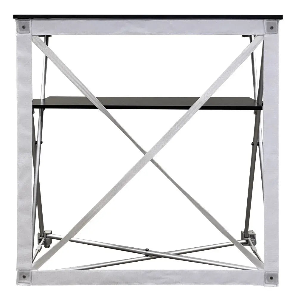 The RPL counter is a quick and simple solution for a portable countertop with fabric graphic display capabilities. Simply pop up the accordion-style frame and connect the plastic locks. The front dye sub-fabric graphic remains attached to the frame, so you only need to secure the end caps to the sides of the counter. The included countertop and inner shelf are made of durable MDF and feature a black woodgrain style finish. An optional dye sub-fabric graphic can be added to the backside to fully enclose the display (Back graphic must be installed last once the frame, front graphic, countertop, and shelf have been set up) The main front graphic with end caps is attached with 2" loop velcro, so it is very easy to change your message at different events. The counter top is hinged so it can fold and pack down into the included travel bag with carry handles.