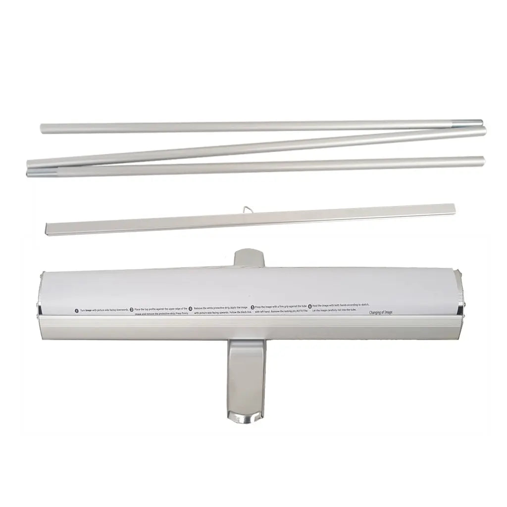 Three sizes are available: 33.5”, 24”, and 48”. The package includes a set of hardware and a carrying case. Hardware only. A graphic for the banner is not included.