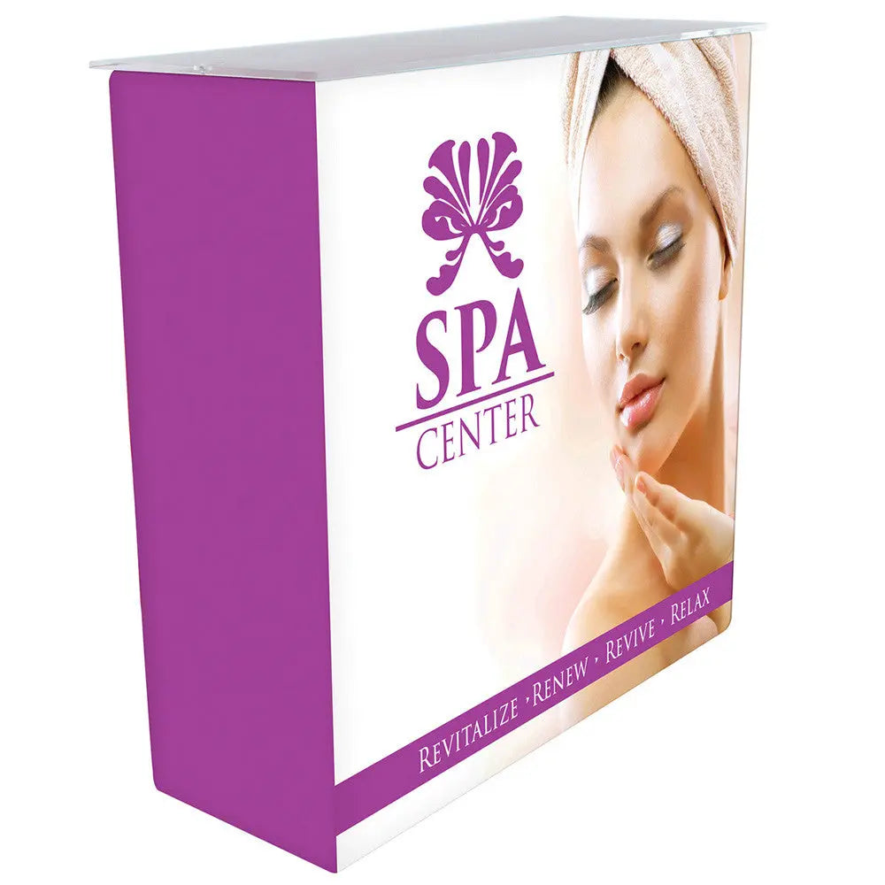 Introducing the new Fabric Counter display, developed to combine convenience and show. Leave your tools at home because this unit is completely toolless. Push button snaps connect the lightweight aluminum framework together. Slip the fabric over the frame, hook and loop the fabric piece underneath and zip shut the backside. attach countertop. Graphics are available on the front, back, sides, and top. See your printed graphic through the frosted acrylic countertop piece! This fully enclosed unit unzips to make for a convenient spot to hide stuff. Carry case included.