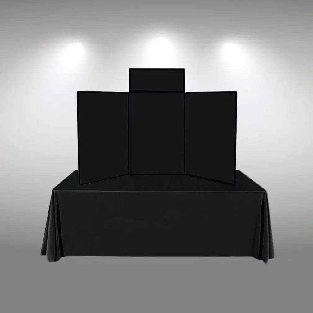 The hook- and-loop folding panel display is constructed of Velcro-receptive fabric on both sides of the boards. The three boards are connected seamlessly with the fabric, resulting in a continuous presentation. When not in use, the panels can be folded into the included carrying bag for storage or shipping. Detachable graphics are available for purchase.